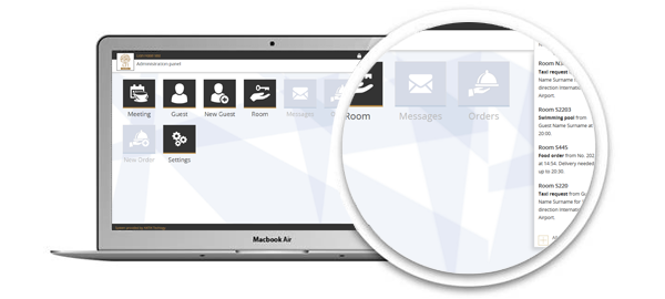 Hospitality menu is displayed in the left side of the screen, right side of the screen contains solved and unsolved guest requests. The icons, that will appear right after your log in, allows you to add new guest or view guest list, available rooms, new order or new messages. You can also see statistics showing number of accommodated guests, number of received orders in last 30 days and number of accepted orders in last 30 days.